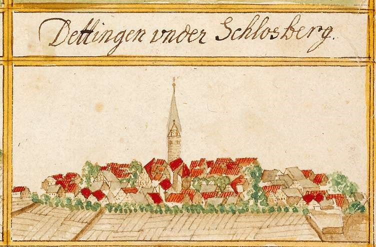 Der Wohnort der "Anstifterin": Dettingen unterm Schlossberg, aus: Andreas Kiesers Ortsansichten, 1681−1687. © Landesarchiv Baden-Württemberg, Hauptstaatsarchiv Stuttgart H 107/7 Bd. 5, Bl. 9, Bild 1.