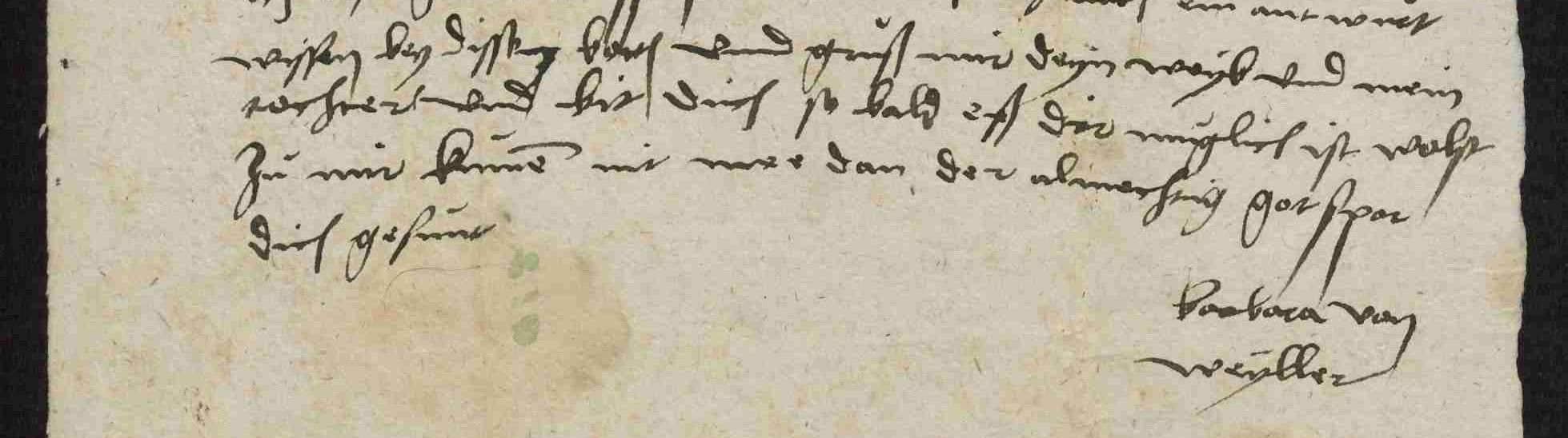 Barbara von Weiler warnt ihren "herzlieben" Schwager in einem Brief vor der Gefahr eines Bundes mit den Aufständischen, Briefausschnitt mit Unterschrift.
