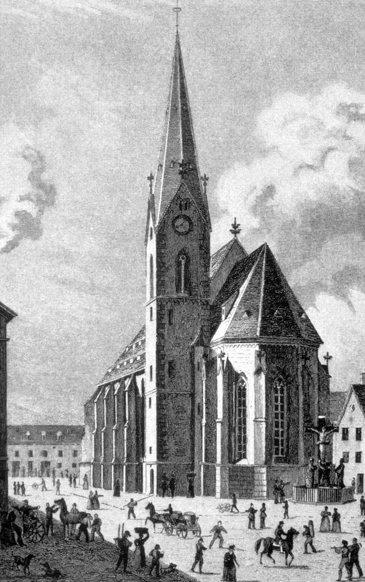Bereits 1511 wird die Leonhardskirche Wirkungsort Mantels, Kupferstich nach einer Zeichnung von Friedrich Keller, um 1840. © gemeinfrei.
