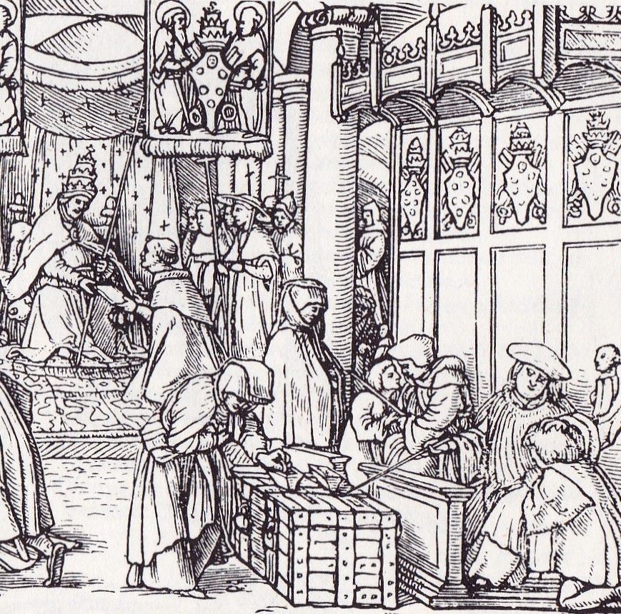 Szenen des Ablasshandels, Ausschnitt aus einem Holzschnitt von Hans Holbein d. Ä., frühes 16. Jahrhundert. © gemeinfrei.