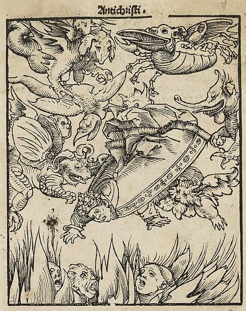 Die Höllenfahrt des Papstes, satirische Darstellung des Papstes als Antichrist von Lukas Cranach d.Ä., 1521, Holzschnitt. © gemeinfrei.