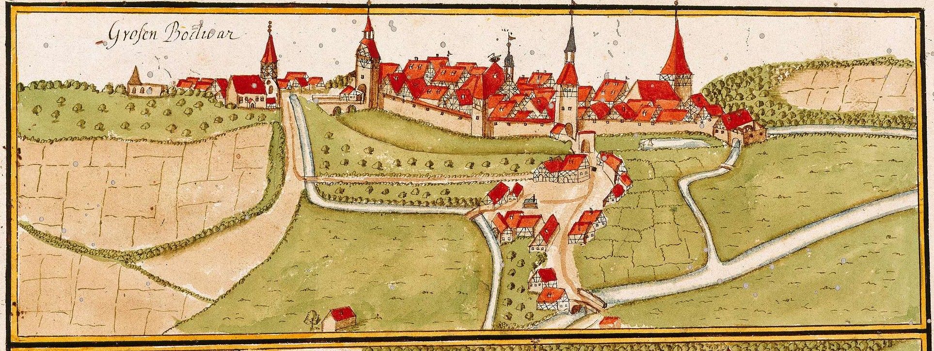 Großbottwar in Andreas Kiesers Ortsansichten, 1681−1687. © Landesarchiv Baden-Württemberg, Hauptstaatsarchiv Stuttgart H 107/14 Bd. 6, Bl. 6, Bild 1.